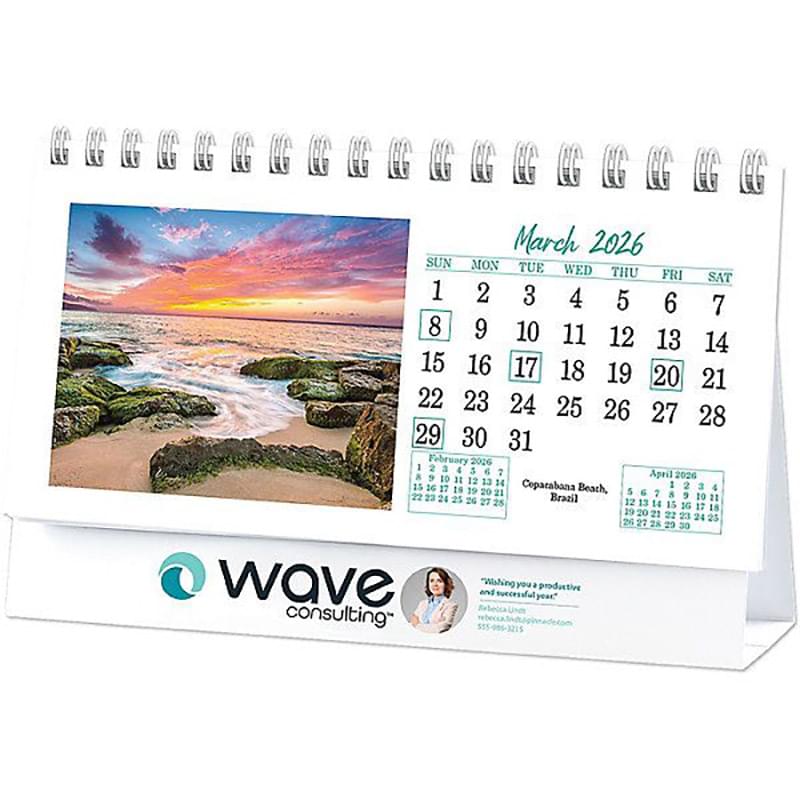 13 Months included. 6 Full color breath taking pages. Easy viewing stand alone, single loop spiral binding. Personalize with your Full Color business information.